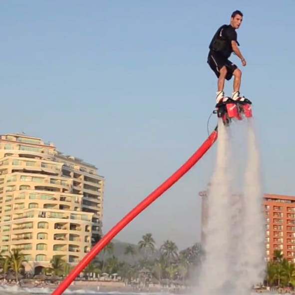 El dispositivo esta conectado con una moto acuática para generar la propulsión del agua y que el usuario pueda volar y hacer piruetas sobre el mar.